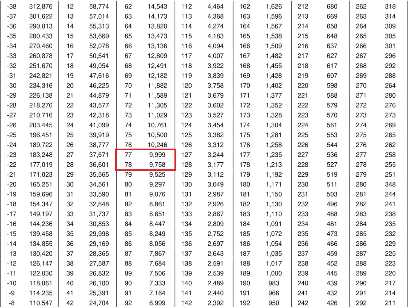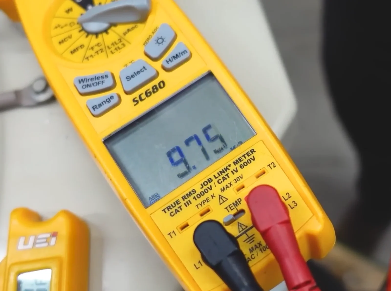 Take the ohm reading and consult a chart that shows the resistance readings and their corresponding temperatures. Your meter’s resistance reading should be pretty darn close to the chart’s resistance value for the ambient temperature measured on your thermometer. Note that your meter will most likely auto-range to the kilohm scale (shown below), so you may need to multiply it by 1000 to interpret the reading on the chart. In this case, the ambient temperature was just above 77°F.